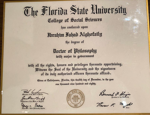شهادة الدكتوراة من جامعة ولاية فلوريد الولايات المتحدة الامريكية
